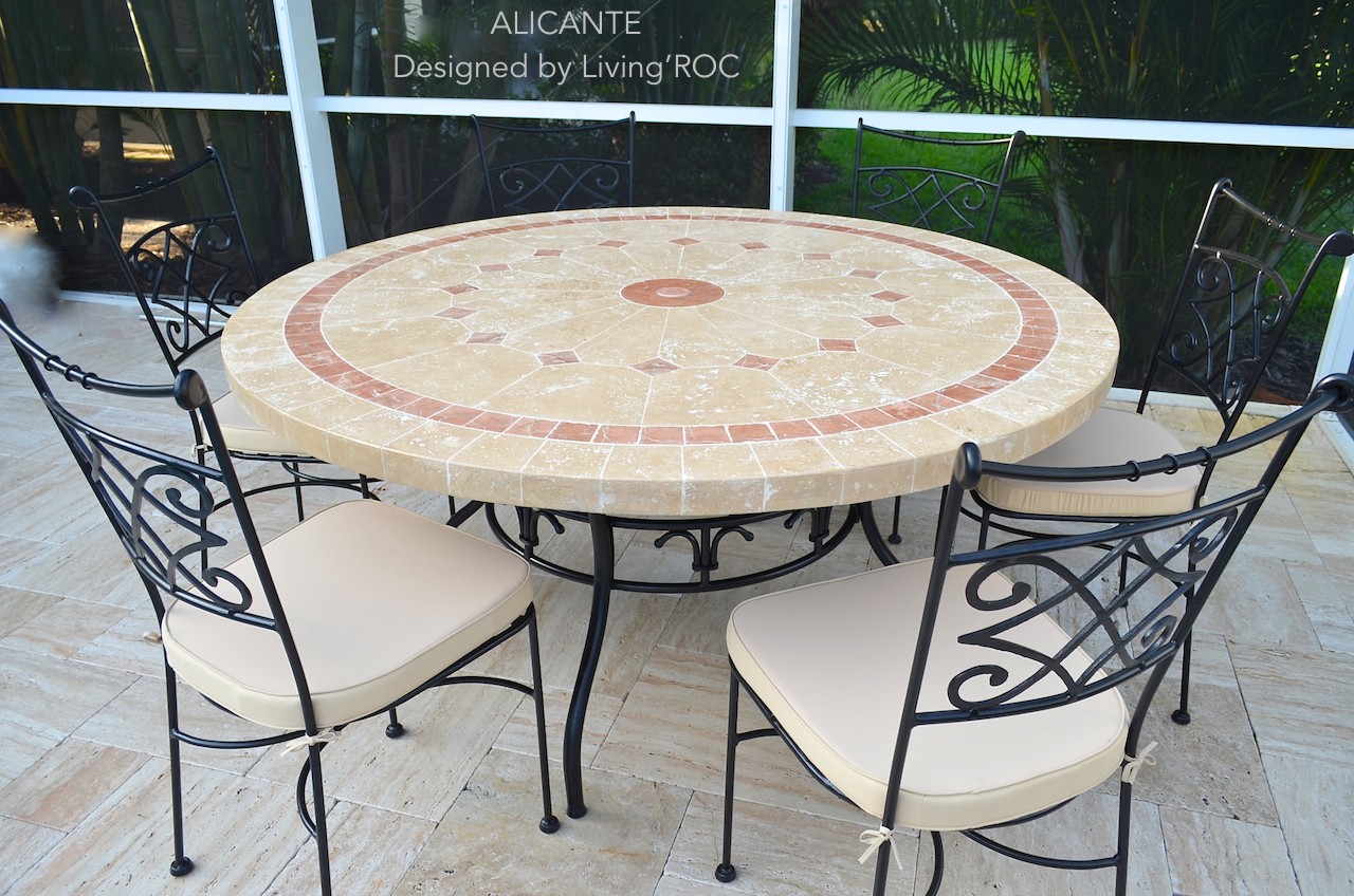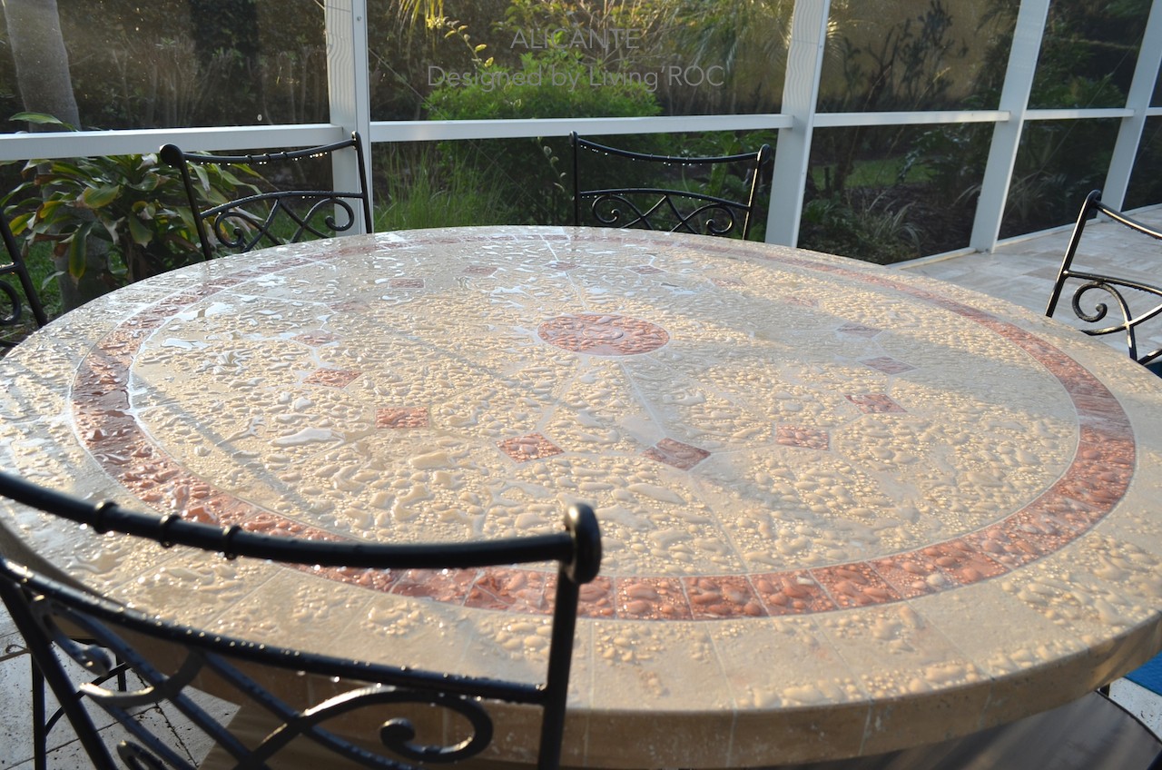 Table de jardin mosaïque de marbre ronde 125 160cm ALICANTE - Ambiance espagnole! Découvrez la sublime le modèle Alicante et laissez vous séduire par rencontre entre le marbre rojo alicante et le travertin beige. Une ligne élégante et une structure robuste et soignée qui font de cette table en pierre (marbre) ; (vendue sans les chaises) une valeur sûre qui s'intégrera à merveille à votre environnement.